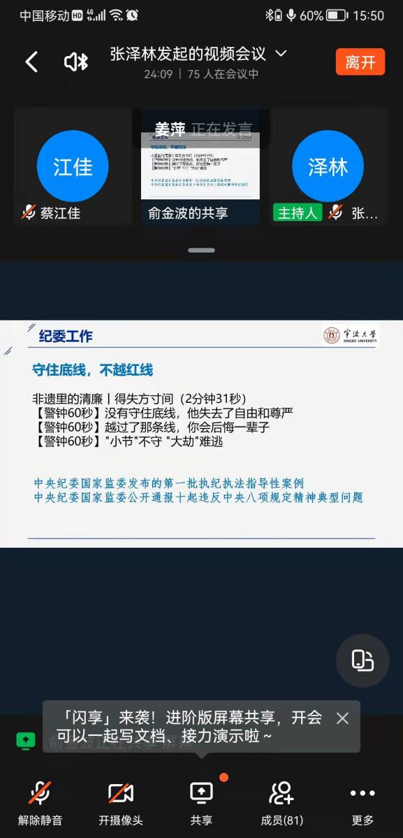 利用钉钉会议线上开展以“坚守底线,不越红线”为主题的廉政专题学习会。会议由学院党委书记俞金波主持。