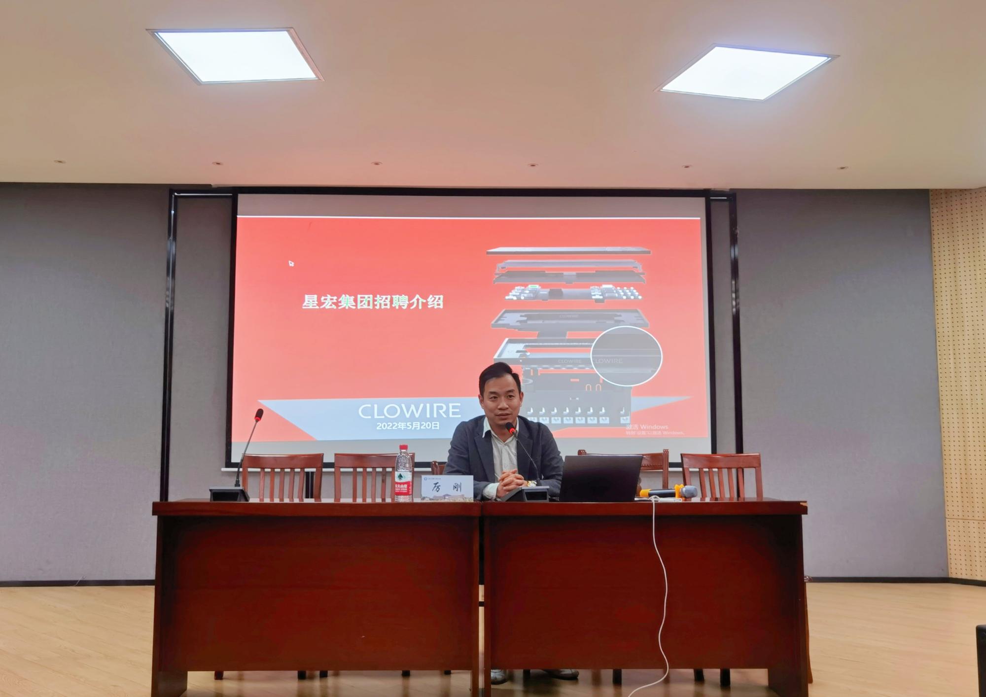 杰出校友厉刚带来企业招聘宣讲。他介绍了公司的品牌文化、发展历史、产品体系和招聘需求。宣讲后,他与部分有求职意向的同学进行了深入的沟通与交流。