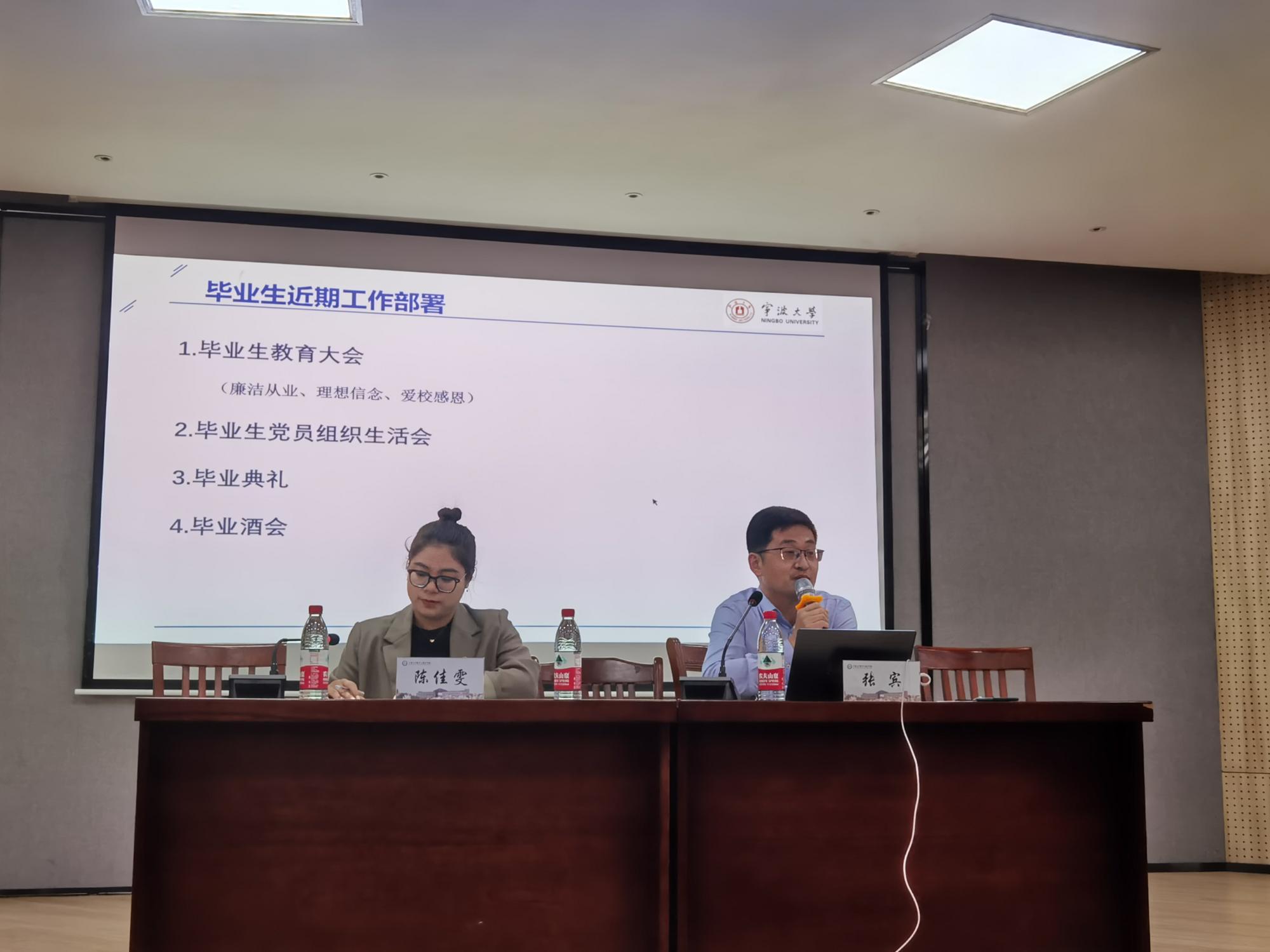 会议伊始,张老师介绍了会议的主要流程,包括毕业季工作安排、就业动员和就业宣讲三部分内容。首先张老师为毕业生讲解了近期工作部署,主要包括毕业生教育大会、毕业生党员组织生活会和毕业典礼等安排,毕业生档案、毕业审核等材料的完善,以及双证领取、就业派遣、毕业照等相关事宜,并着重强调要重视党员组织关系的转接。陈老师就毕业生工作进行了几点补充,主要强调了智慧团建团关系转接、毕业离校流程以及体检等各项事宜。