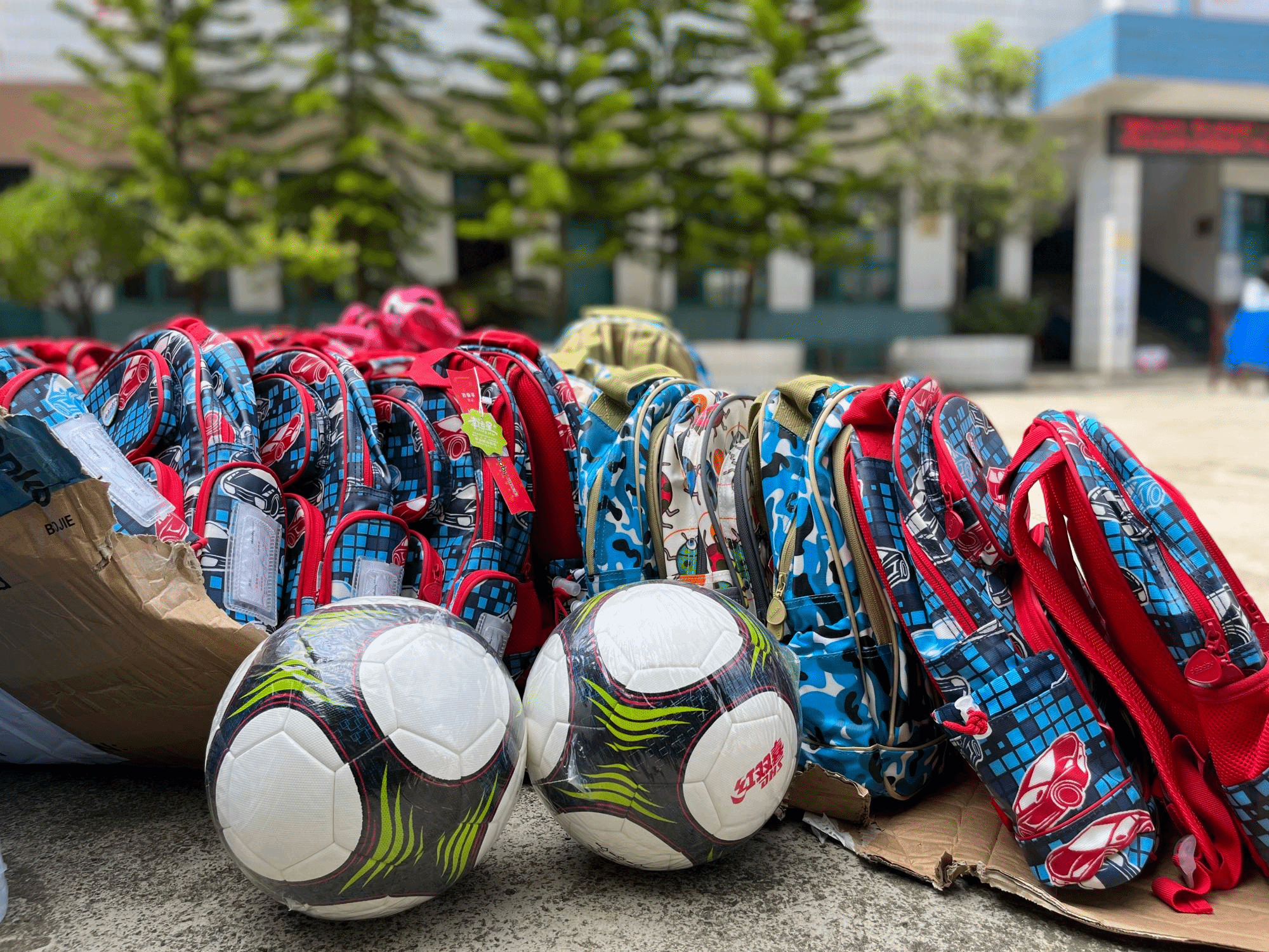 打开装着书包的箱子时,孩子们不禁欢呼了起来,里面装满了五颜六色各式各样的全新书包。