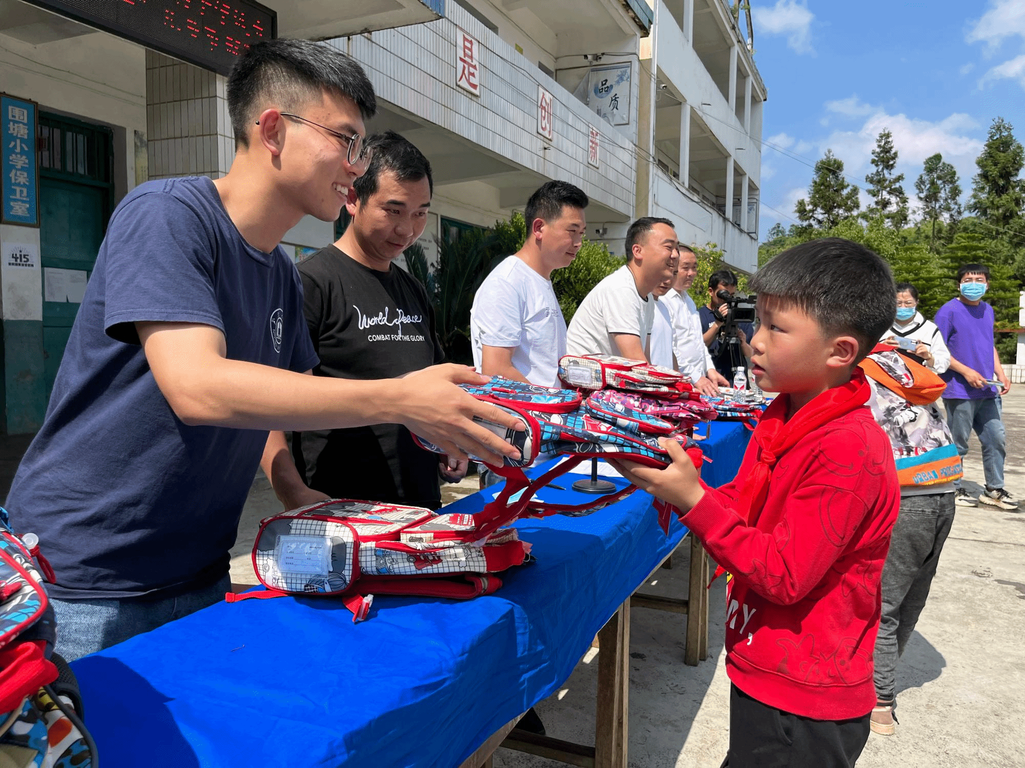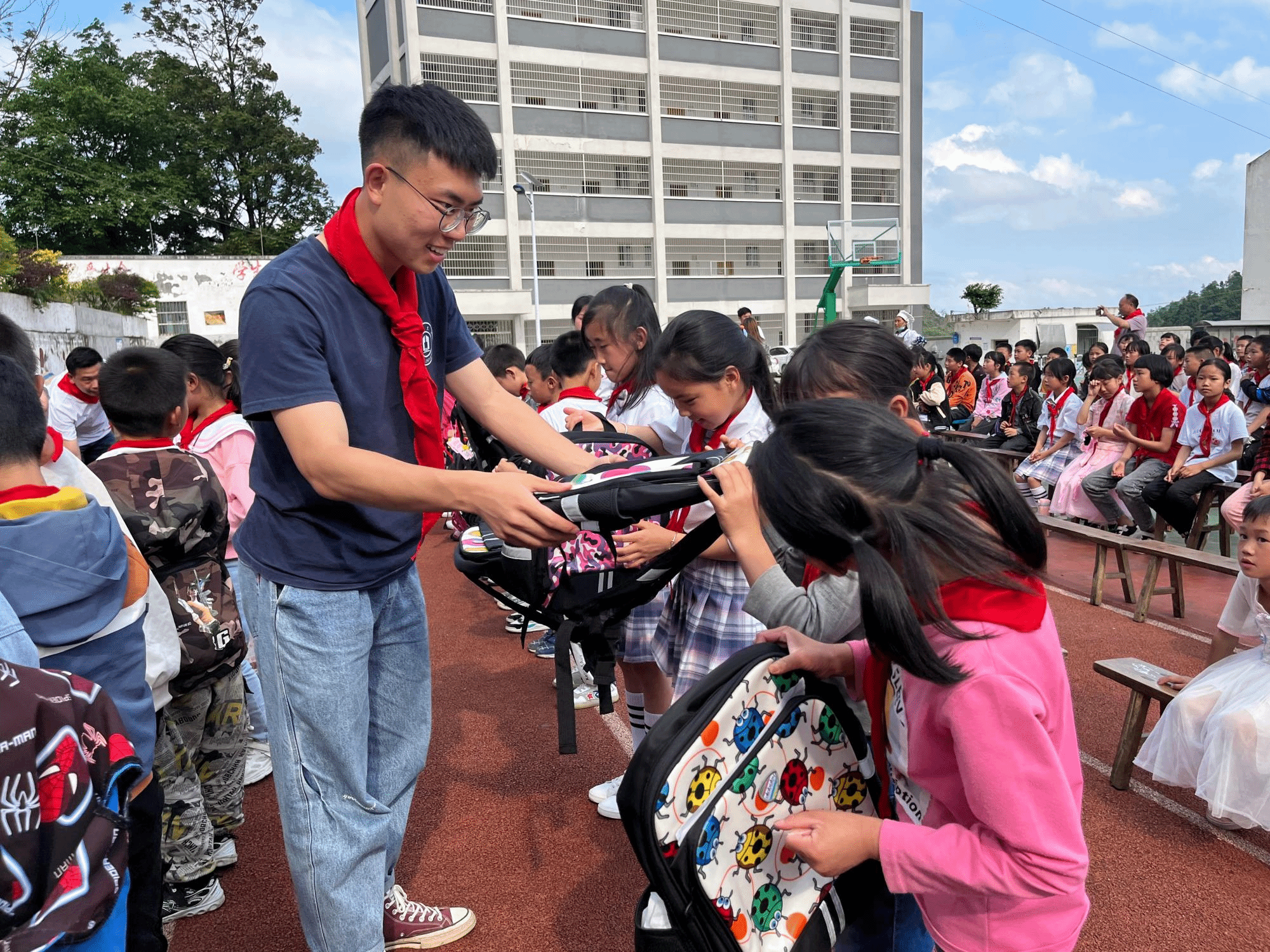 校友严正捐赠的100个书包分别前往贵州省兴仁市百德镇围塘小学和沟边小学,为孩子们送上祝福和礼物,以实际行动传递对儿童的关爱。
