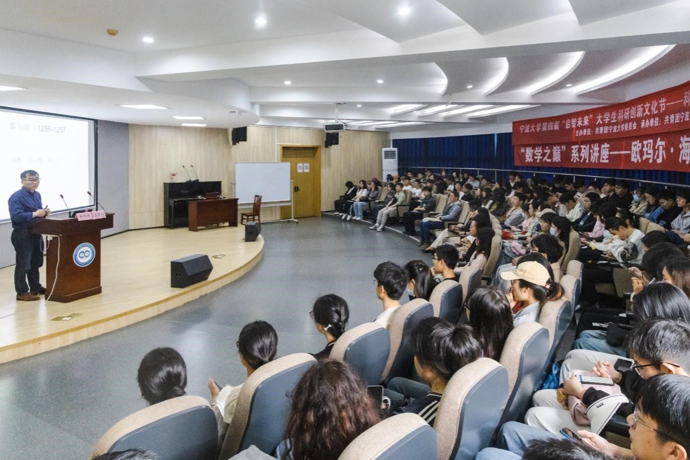 蔡教授从海亚姆的“身体世界”、“智力世界”和“精神世界”,详细介绍了他在几何方法求解三次方程以及对欧几里得第五公设的证明尝试,后一点正是非欧几何学的起点。同时,蔡教授也探讨了海亚姆《鲁拜集》的诗歌创作,这部作品已被译成多种语言,中文版首版由郭沫若翻译,至今已有十多个版本,最新版由他本人翻译。