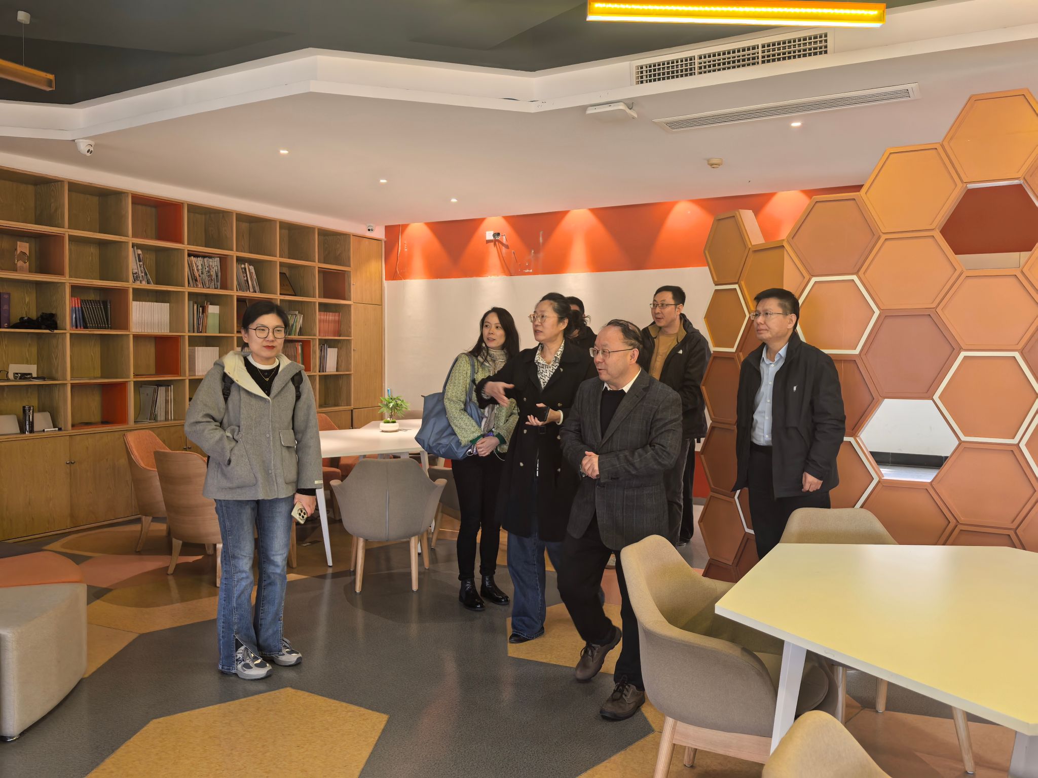 学院主要领导带领参观并讲解了学院的“人才之家”物理空间布局和建设的科研办公环境。会上,屈长征汇报了学院的发展历程、学科情况和师资队伍现状,并围绕“一站二厅三家四室”简要介绍了学院“人才之家”的建设情况。霍妍补充说明“人才之家”不仅是体现在硬件设施上,更是体现在学院对人才的人文关怀上,我们的人才之家是温暖、舒适、和谐、安全的,在这样一个大家庭里大家凝心聚力实现个人价值、推动学院事业发展,像院徽∞标志一样,发展无限可能。