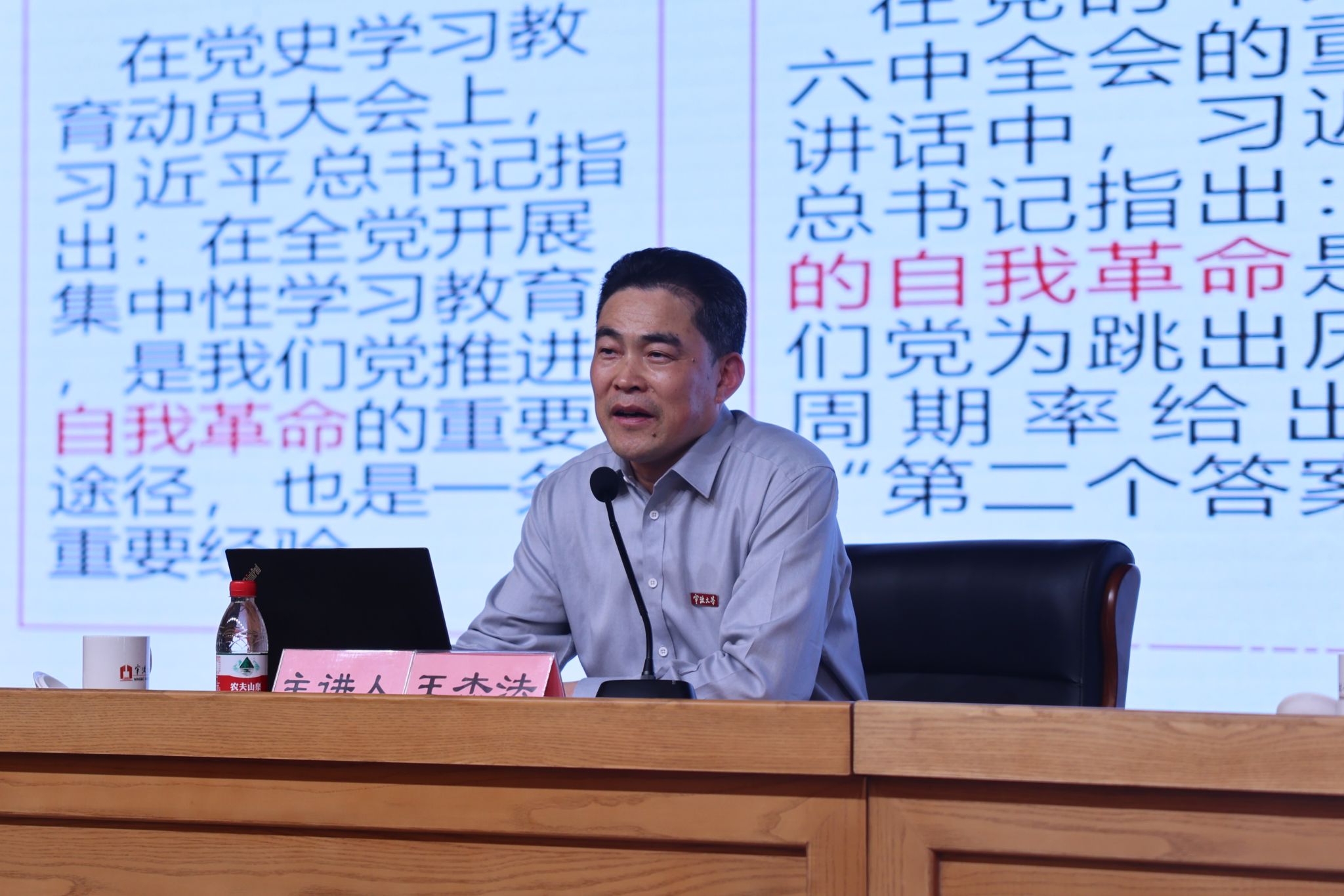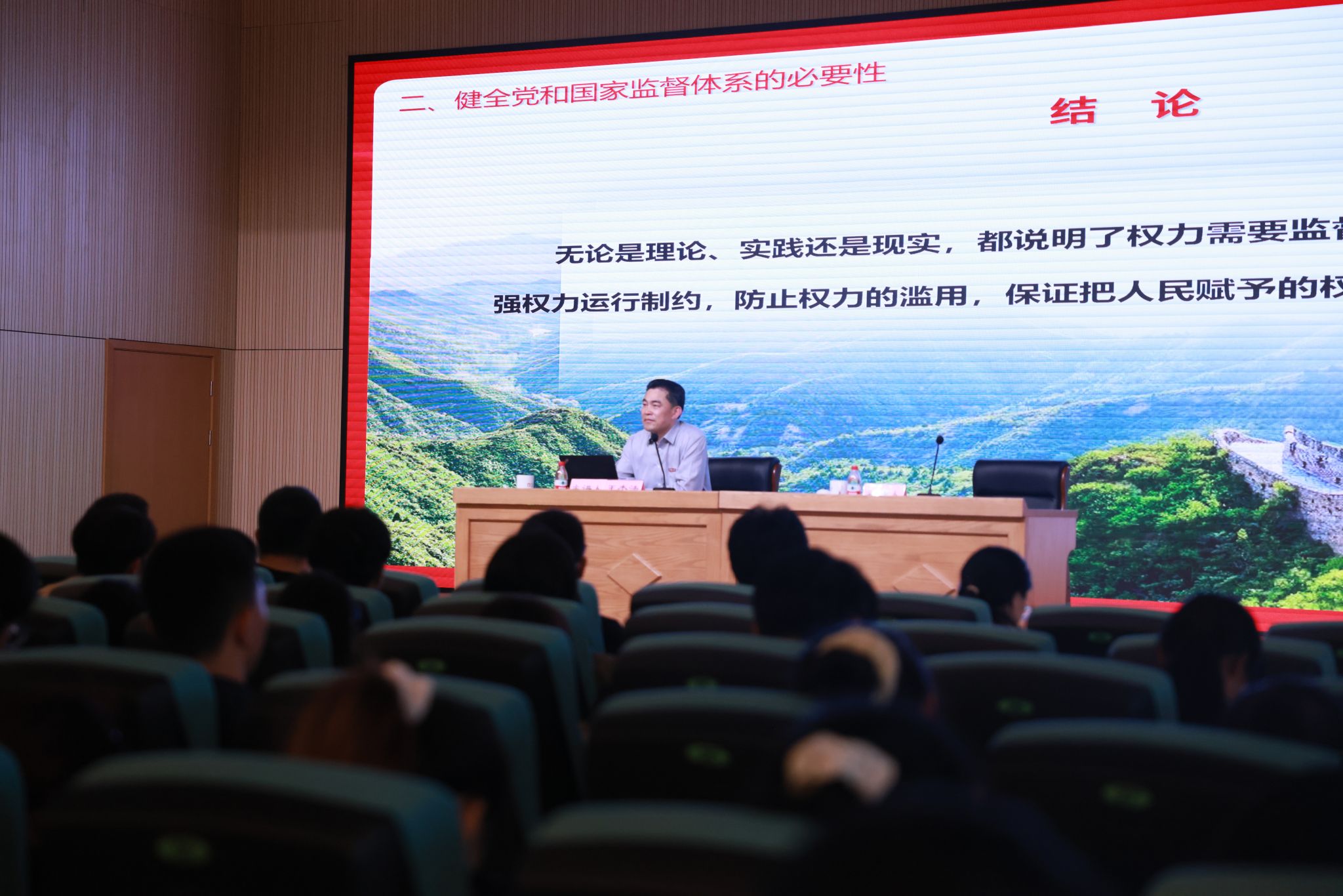 讲座伊始,王杰法书记详细阐述了习近平总书记关于党的自我革命思想的发展脉络及其核心要义,深入剖析了“为什么要自我革命”、“为什么能自我革命”以及“如何推进自我革命”三大问题。王书记着重强调了健全党和国家监督体系的必要性,阐释了党内监督与人民监督对维护党的先进性和纯洁性的重要意义。随后,王书记指出,要完善监督体系,必须深化纪检监察体制改革,推动监察机制的进一步完善。他特别强调,应借助数字化手段提升监督效能,强化政治和经济领域的监督,充分发挥巡视巡察和审计在全面从严治党中的关键作用。