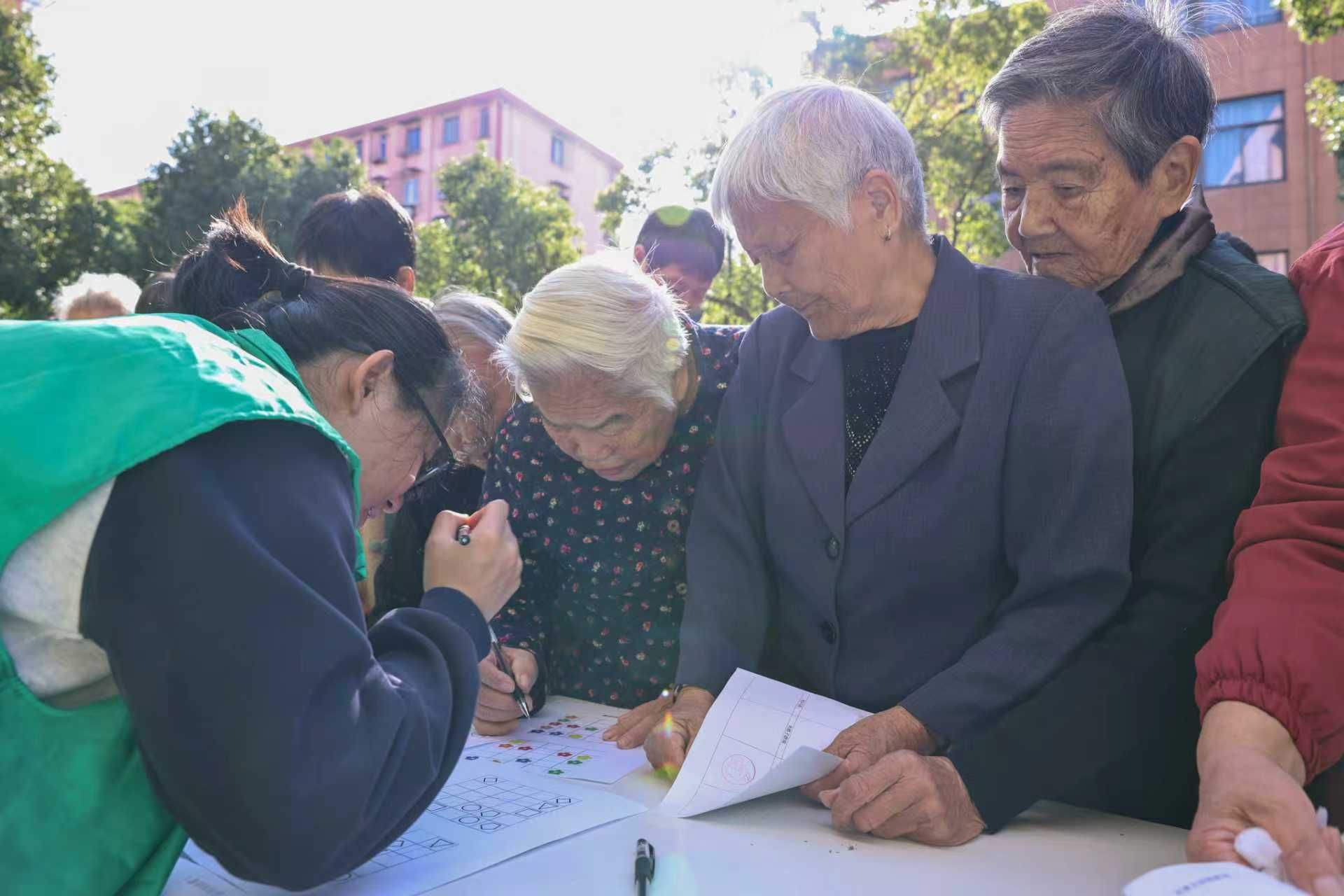 与此同时,银龄益智游戏区亦是热闹非凡。小“数”苗们利用专业特色,精心设计了一系列专为老年人打造的数学益智游戏,旨在助力银发群体提升认知功能,延缓大脑衰老。在专注力训练图纸前,小“数”苗蹲在老人身旁,轻声提醒连线要领;讲解图形连连看规则时,小“数”苗用手势辅助说明“不交叉” 的技巧;在纸杯排序环节里,小“数”苗陪着老人按自己的节奏复原数字。活动现场,老人们在思维碰撞与协同合作中重焕活力,成就感溢于言表,欢声笑语此起彼伏。