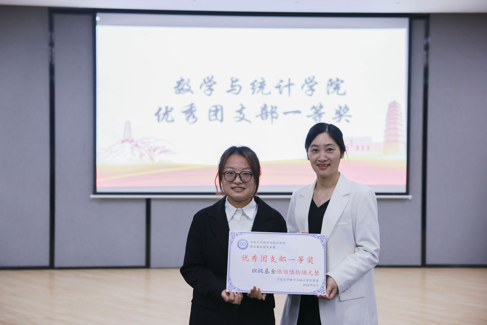经评委们细致严谨的评审,最终22数师班团支部以其卓越的表现荣获一等奖;22金工班团支部和22数创班团支部凭借,共同获得二等奖;22数学2班、22精算班以及23数创班团支部获得三等奖。学工办吴琳华、孔家辉老师为获奖班团组织颁发荣誉证书并合影留念。