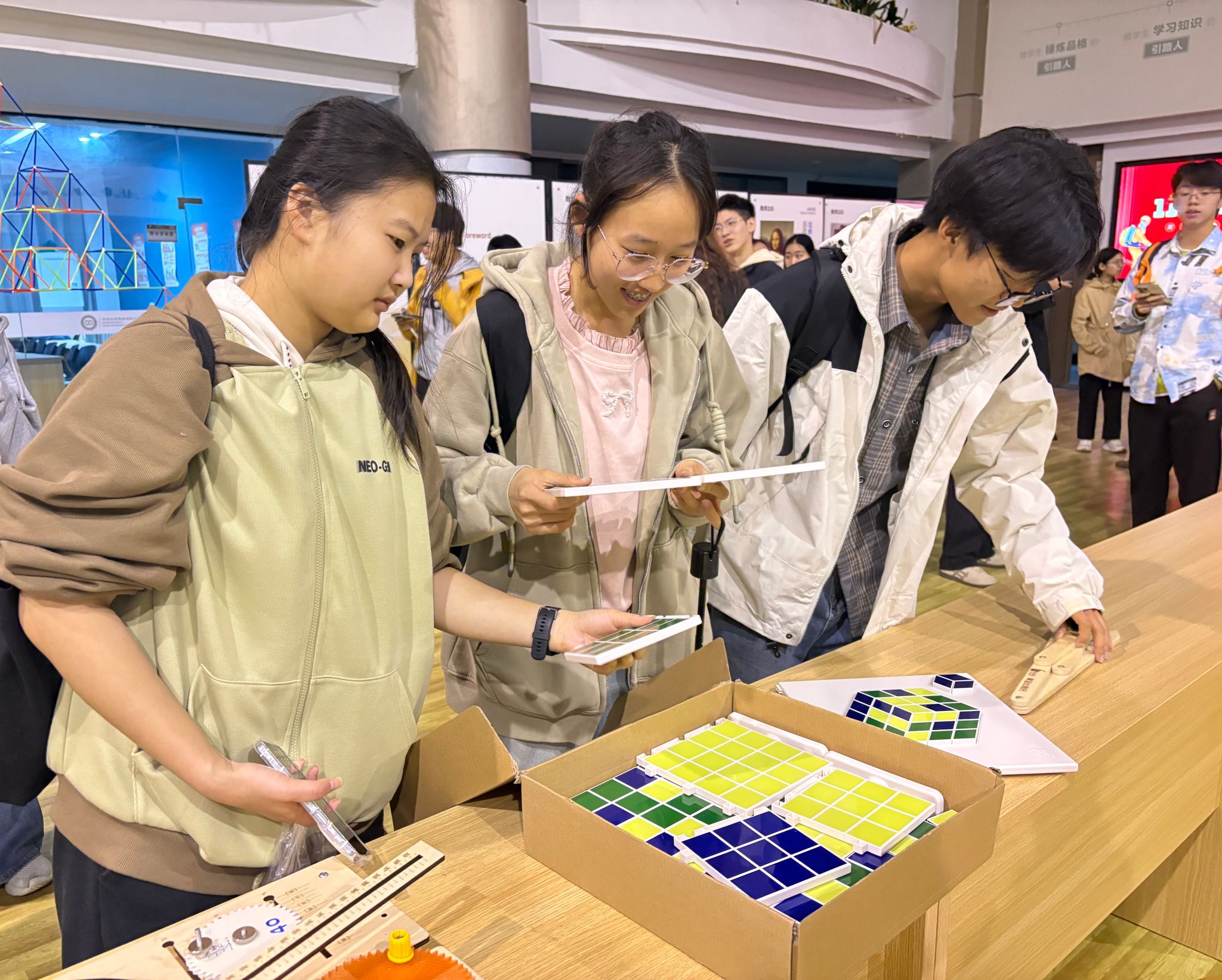 精心策划的“数学之美特展”精彩亮相。展览以“以数启美,以文化人”为主题,通过图文展板、实物模型与互动游戏相结合的形式,将抽象的数学知识转化为直观的美学体验,吸引了校内外师生、校友及市民驻足参观,成为建校纪念周系列活动的一大亮点。