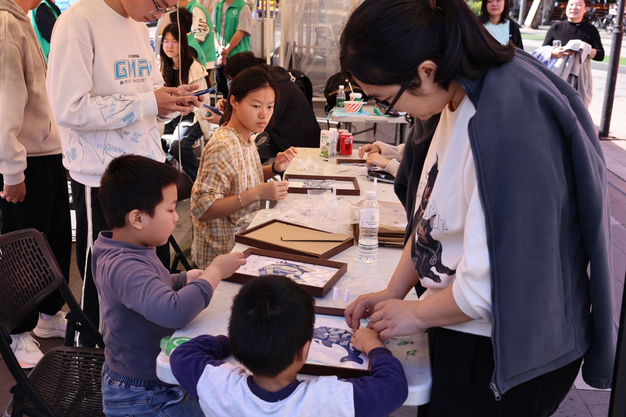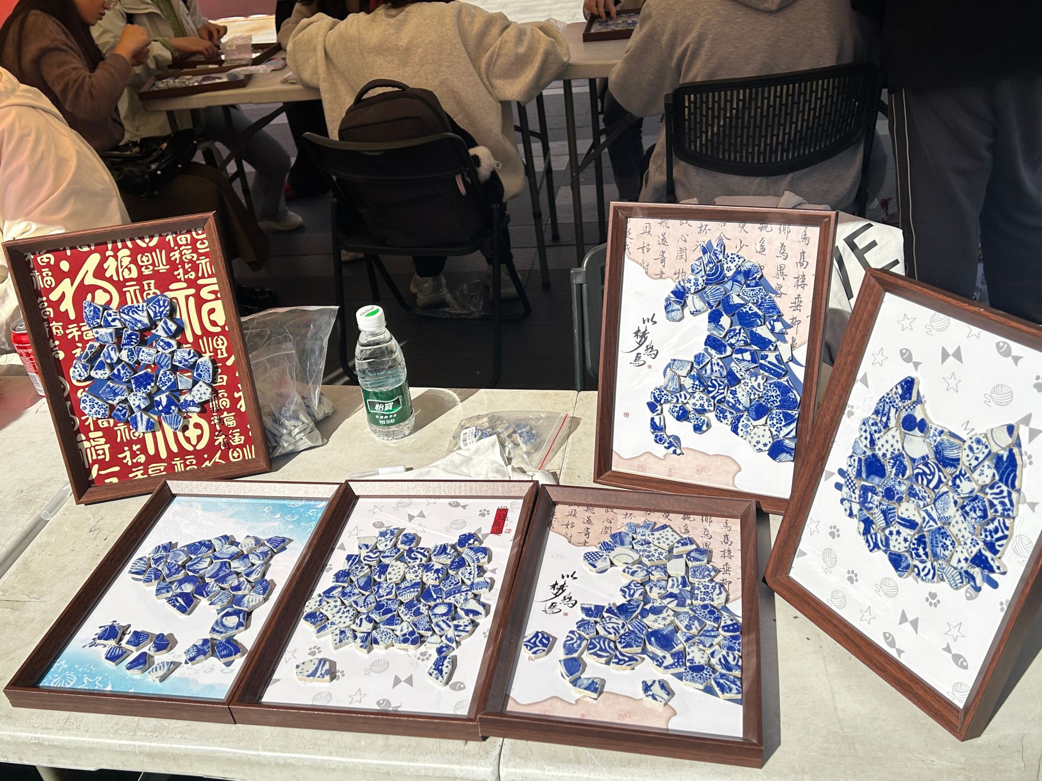 在活动现场,蓝白相间的青花瓷碎片静置于工作台上,与各式相框、衬纸共同构成创作的起点。这些瓷片承载着悠久的烧造历史与精妙的非遗技艺,纹样中蕴藏着百福图、奔马、海洋等主题的吉祥寓意与美学逻辑。在专业指导下,传统青花元素与现代创意理念相互交融,为整个活动奠定了深厚的文化基调。