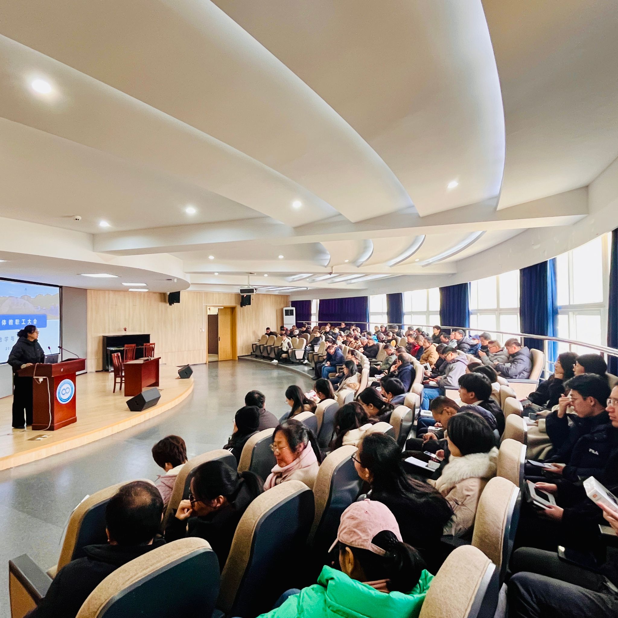 1月6日,数学与统计学院在113报告厅召开期末全体教职工大会。会议由院党委书记霍妍主持,学院全体教职工参加。