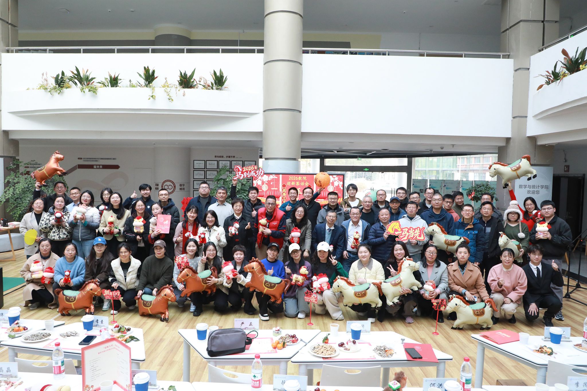 1月15日下午,数学与统计学院“骁腾万里,数梦启航”2026年迎新茶话会在学院一楼大厅成功举办。学院领导、各系部门教师和校友会的众多成员欢聚一堂喜迎新年。