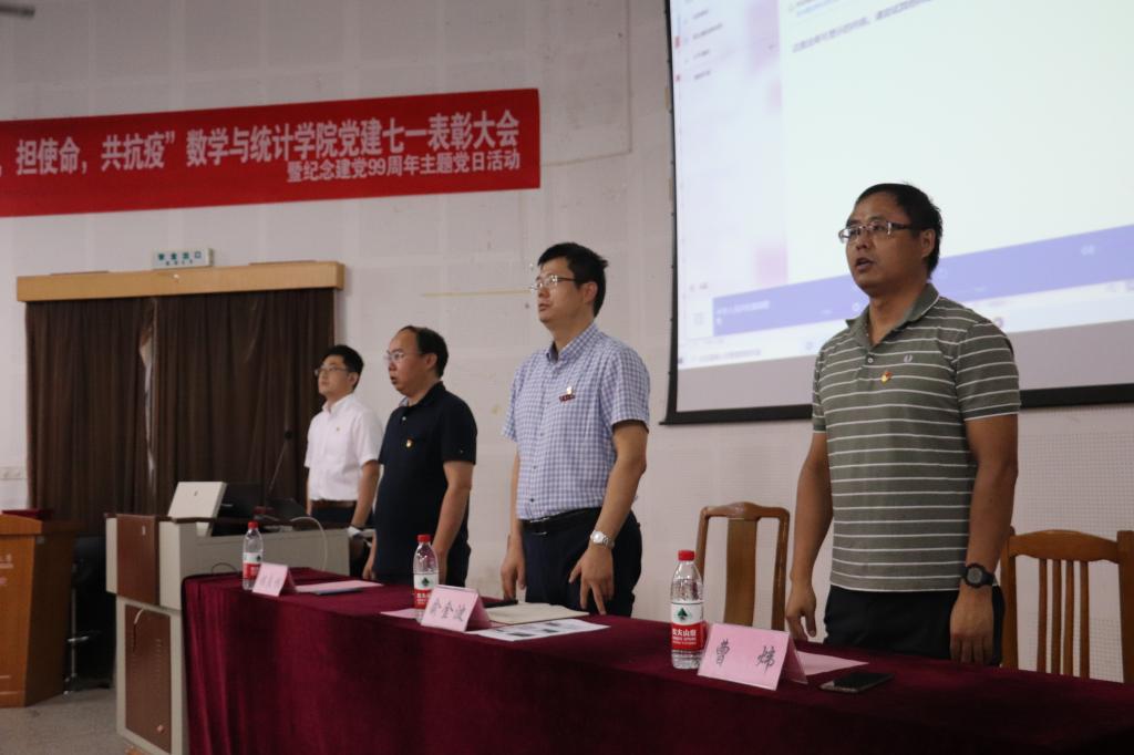在庄严的国歌声中,表彰大会拉开序幕。曹炜同志带领18位新发展党员面对党旗郑重宣誓,一句句誓词掷地有声、动人心魄,坚定了共产党员的初心使命,激励着全体党员保持奋斗精神,继续在学院发展建设中争当模范。随后,张宾同志宣读了“七一”表彰决定,表彰了2019-2020学年我院各类先进集体和优秀个人。获奖集体和个人充分展示了我院主题教育尤其是抗疫以来各党支部和广大党员的风采。在欢快的颁奖曲中,胡良根同志为获得表彰的先进集体和优秀个人颁发荣誉证书。最后,俞金波同志为“分流搬寝”、“考研辅导”、“清风行动”三支党员突击队授旗,鼓励他们充分发挥党员先锋作用,积极推进学生社区治理,毕业就业、学风建设和安全稳定等工作,为学院各项事业发展做出更大贡献。