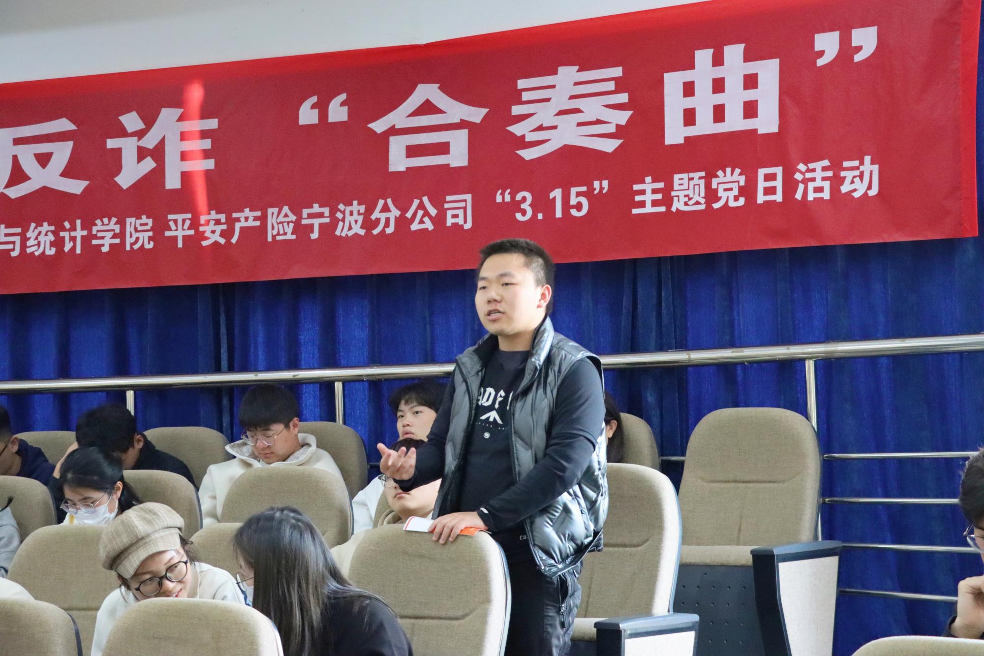 党委联合平安产险宁波分公司党委,开展以“时刻绷紧防范之弦,严防电信网络诈骗”为主题的党建联建活动。活动由学院党建辅导员孔家辉主持,平安产险宁波分公司丁立柯、魏国胜及学院部分师生党员、积极分子参加活动。