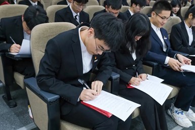 党委副书记兼纪委书记姜萍在宣读了学院各学生组织的学生干部名单之后,强调各位学生干部务必牢固树立廉洁意识,自觉践行社会主义核心价值观,不为物所诱、不为利所惑,带头营造良好社会风气。在场的全体学生干部集体签署干部廉洁承诺书,承诺在未来的生活、工作中做到加强修养,恪守本分,规范言行,牢记宗旨,扎实做事,廉洁自好,不谋私利,破除陋习。随后,党委书记俞金波为学生干部们颁发了聘书。